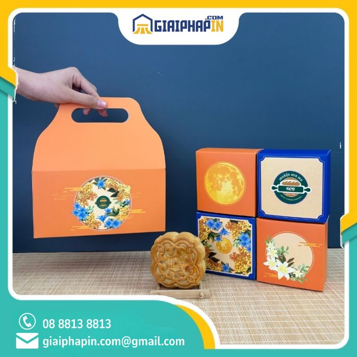 Hộp quai xách được tùy chỉnh với các họa tiết mang đậm nét văn hóa Trung Thu như trăng rằm, lồng đèn, hoa sen, hoặc logo thương hiệu, giúp sản phẩm nổi bật và thu hút khách hàng. Đây là lựa chọn lý tưởng cho các doanh nghiệp muốn tạo ấn tượng mạnh mẽ trong các chiến dịch quà tặng hoặc bán lẻ mùa Trung Thu.